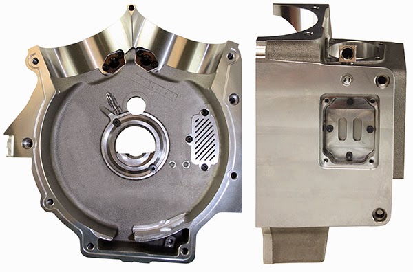 | This view of the bottom half of the case shows the combined pressure and wheel chest scavenge pump on the left, with the second cam chest scavenge pump on the right |