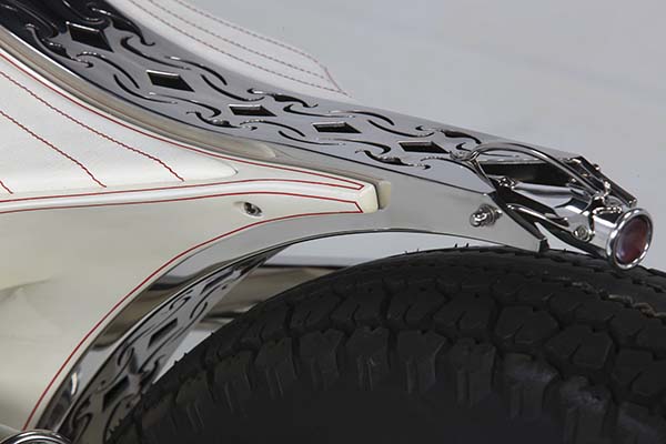 The seat itself on Nut Cracker is almost impossible to see because it has been made from white leather with red stitching by Zac to match the paint on the frame that was applied by Dave Gunby.