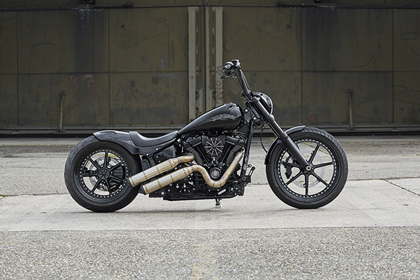 "Installed in the M-8 Breakout, Fat Boy and FXDR models, the rear tire runs precisely centered and without offset. The clear view of the right side of the wheel is enabled by the proven 'Drive Side' arrangement of the brake disc on the left side of the wheel - in this case with Brembo 4-piston calipers." The forward mounted "short" drive belt disappears almost completely behind the frame and swingarm construction, the rear belt runs over two Rick's pulleys, which can be seen rotating while driving - a characteristic "Rick Trick" that delivers a dynamic look.